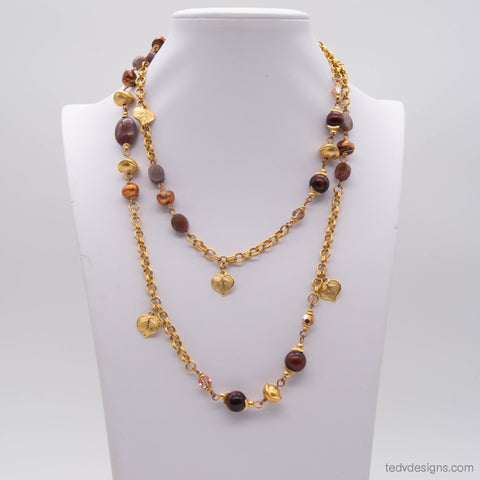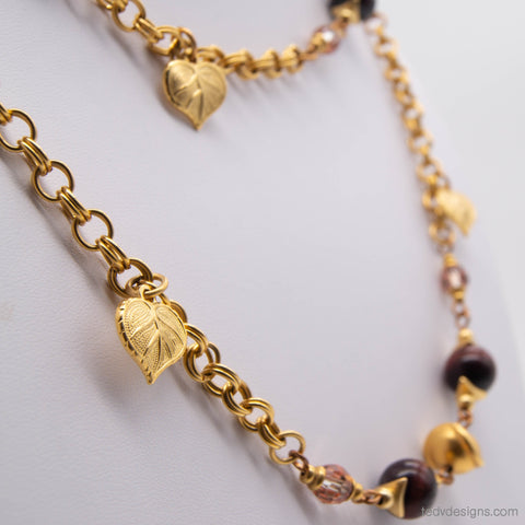 On a 24k matte Gold plate double cable chain, this nature inspired rope has fancy jasper, copper pearls, red tiger's eye, and Austrian crystal, with dangling gold leaf charms. This 40-inch necklace can be worn doubled up for a layered look, or single stranded for a longer style.