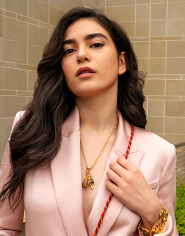 The Charms on Chain Pendant necklace features Smokey Topaz, German Glass Opal, Citrine stones, along with a 24 karat Gold plate key charm.
