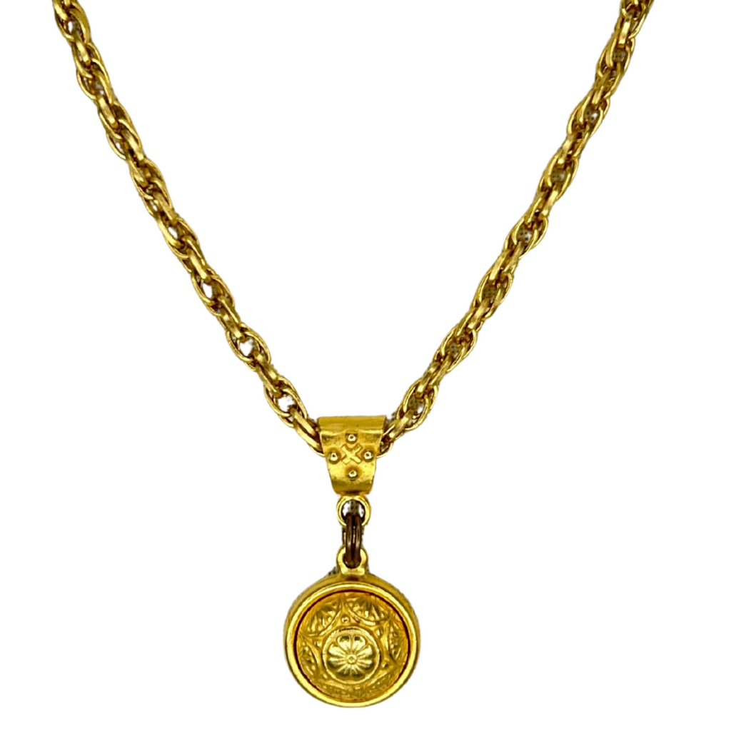The Gold Mosaic Pendant was inspired by a casted vintage European tile and is finished with a 24 karat gold plate.